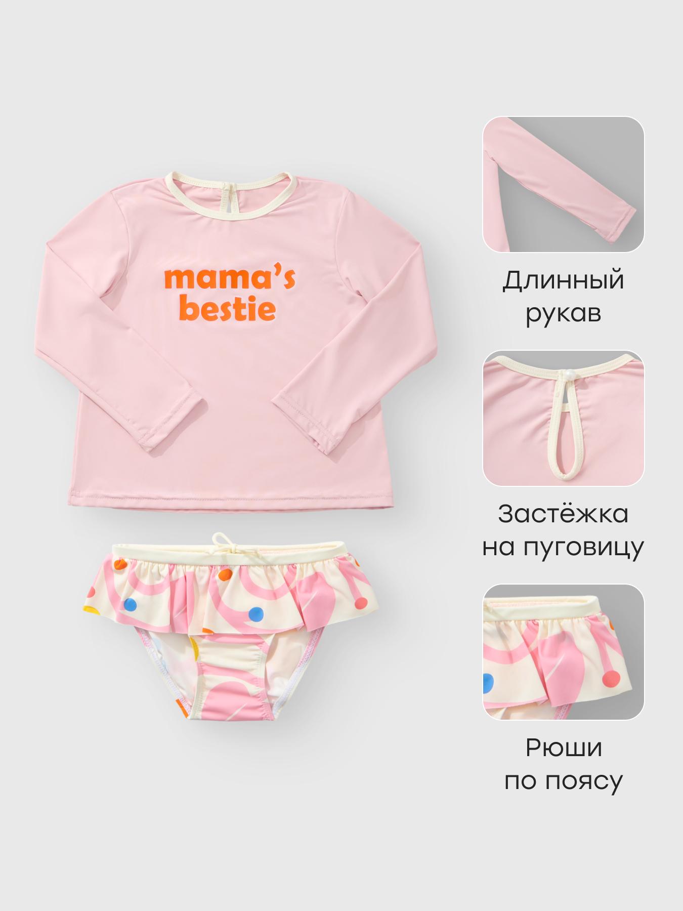 • Материал — быстросохнущая ткань купальника с защитой UPF50+ обеспечивает комфорт и защиту от ультрафиолета
